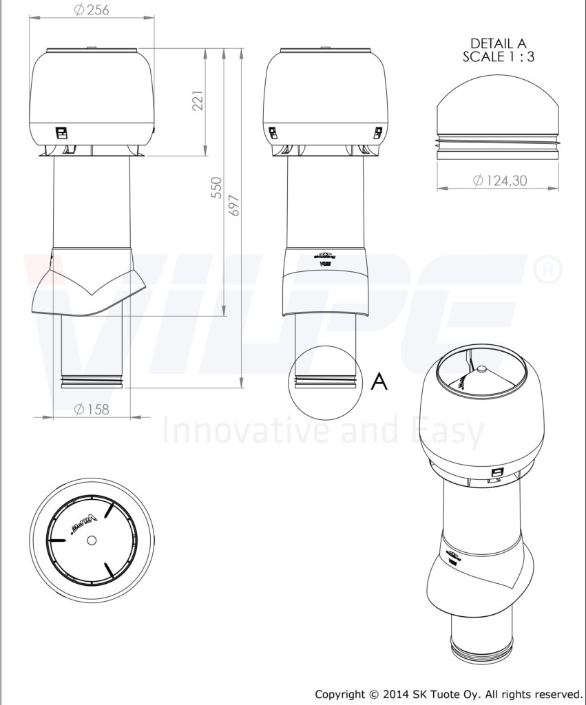 Труба теплоизолирована для предотвращения образования конденсата в трубе. Внутренняя труба изготовлена из оцинкованной стали. Длина внутренней трубы позволяет вставить ее в подводимый воздуховод на длину 300 мм. Это облегчает вертикальный монтаж в тесных чердачных помещениях и делает конструкцию более прочной. Нижний край внутренней трубы имеет резиновый уплотнитель, герметизирующий соединение трубы и воздуховода. Колпак вентиляционного выхода защищает от попадания осадков и грязи в канал. Проходной элемент для монтажа подбирается по типу кровельного материала.