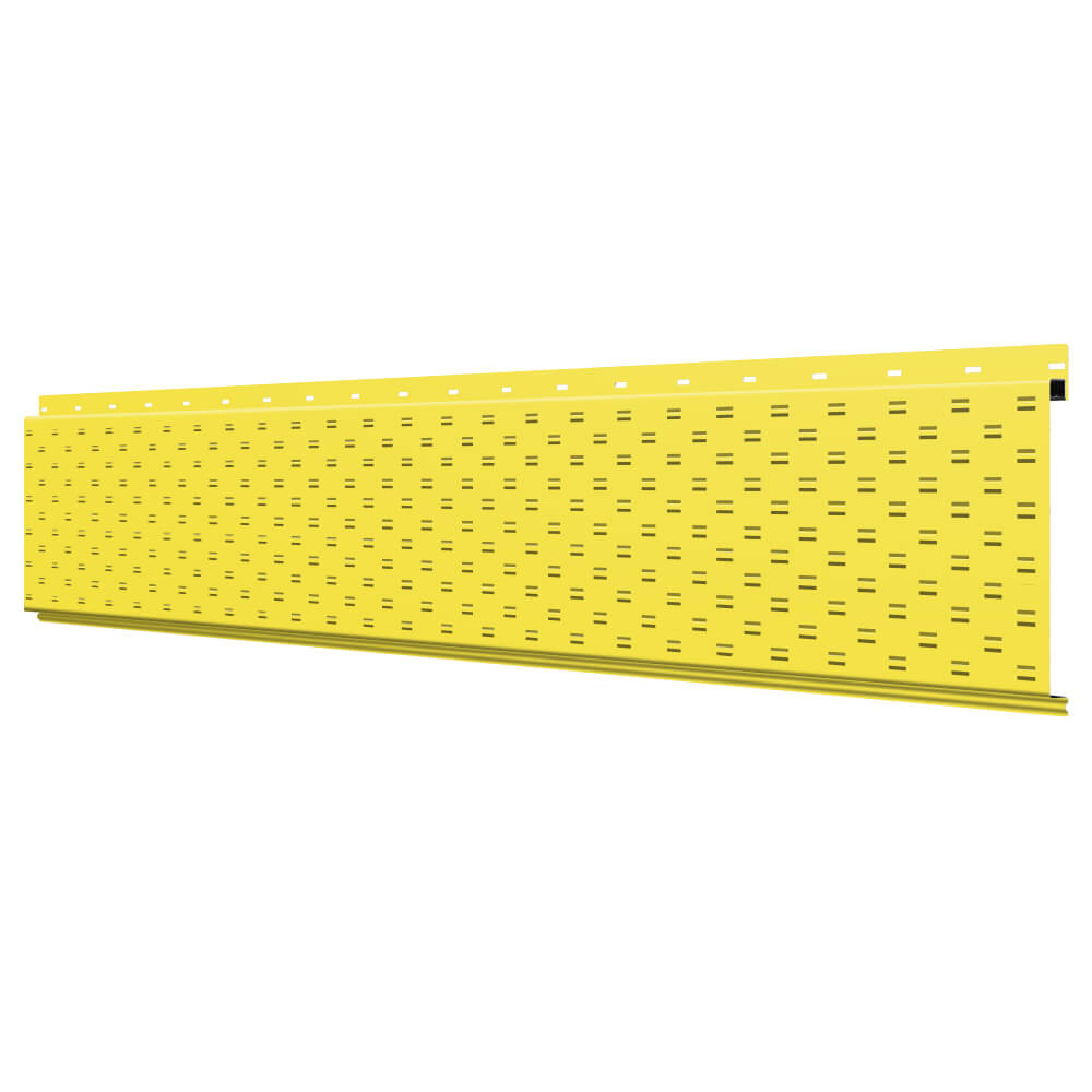 Линеарная потолочно-стеновая панель с ПЕРФОРАЦИЕЙ для вентиляции цвет RAL1018 Желтый применяется в качестве софитов для подшивы крыши, наружной и внутренней отделки потолков, стен, фронтонов фасада дома в Орле.